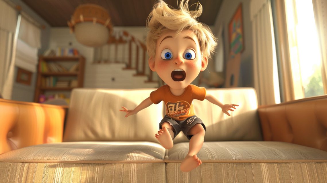 Artistic, Characters Crazy Jumper 3d animation character, toddler, 4 years old, boy, pale skin, sandy blonde unruly hair, bright blue eyes, cute little nose, lots of extra energy, mischievous, jumping on the couch, t-shirt and shorts –ar 16:9